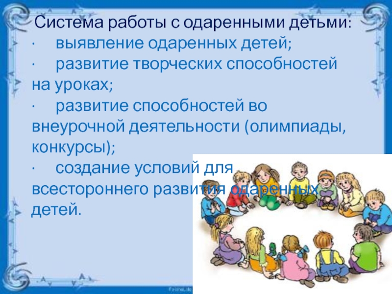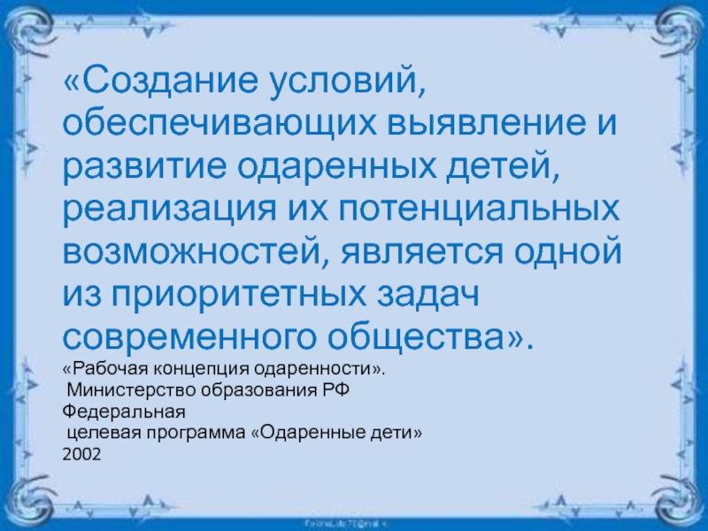 Слайд 3«Создание условий, обеспечивающих выявление и развитие одаренных детей, реализация их потенциальных