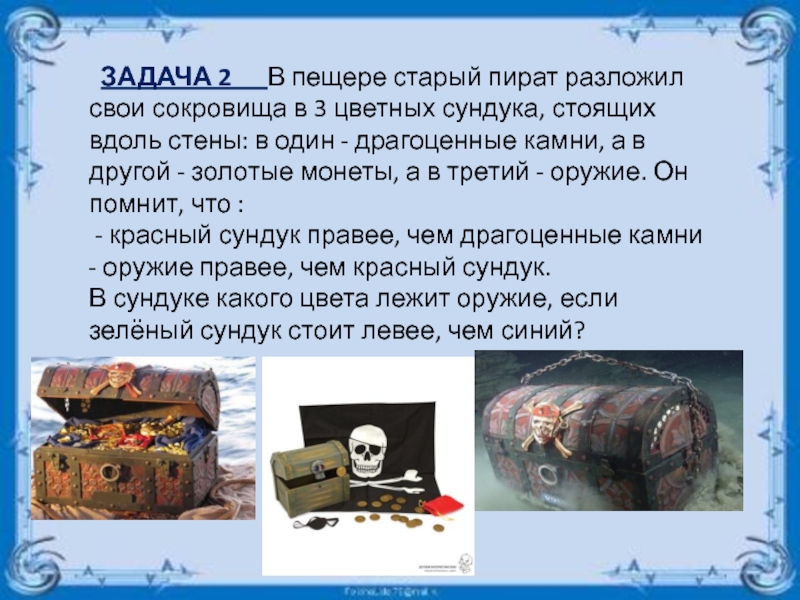 свои сокровища в 3 цветных сундука, стоящих вдоль стены: в один - драгоценные камни, а в другой - золотые монеты, а в третий - оружие. Он помнит, что :