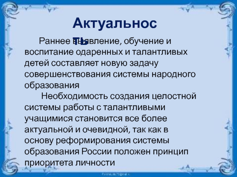 Необходимость создания целостной системы работы с талантливыми учащимися становится все более актуальной и очевидной, так как в основу реформирования системы образования России положен принцип приоритета личности
