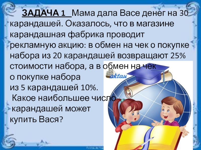 на 30 карандашей. Оказалось, что в магазине карандашная фабрика проводит рекламную акцию: в обмен на чек о покупке набора из 20 карандашей возвращают 25% стоимости набора, а в обмен на чек о покупке набора
