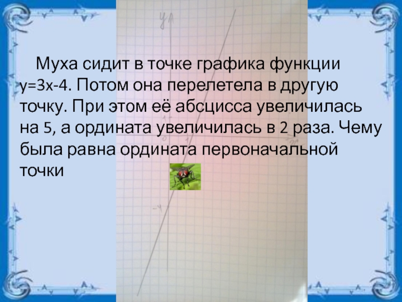 Слайд 14 Муха сидит в точке графика функции y=3x-4. Потом она