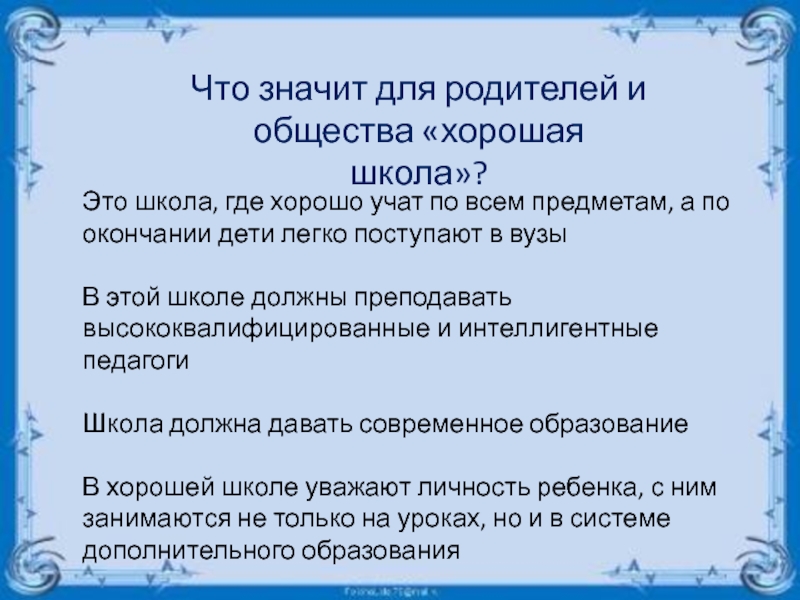 Слайд 6Что значит для родителей и общества «хорошая школа»?