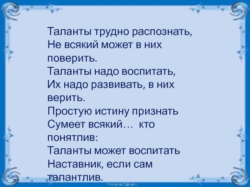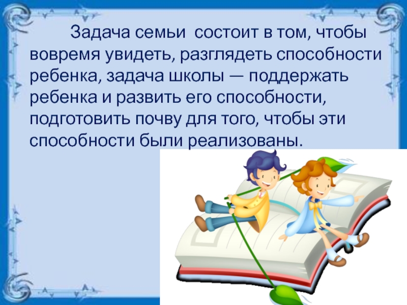 вовремя увидеть, разглядеть способности ребенка, задача школы — поддержать ребенка и развить его способности, подготовить почву для того, чтобы эти способности были реализованы.
