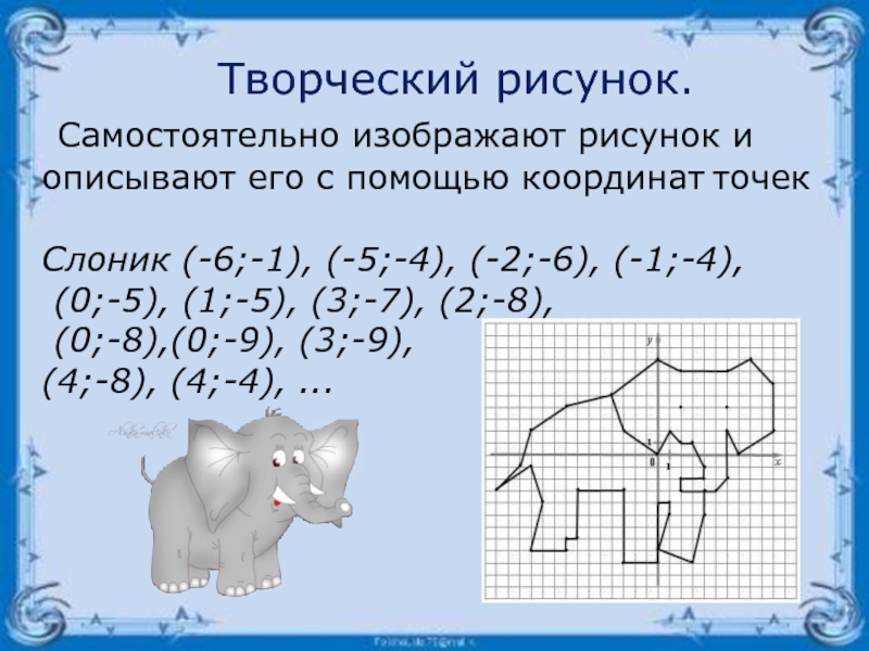 Слоник (-6;-1), (-5;-4), (-2;-6), (-1;-4),