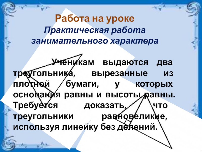 треугольника, вырезанные из плотной бумаги, у которых основания равны и высоты равны. Требуется доказать, что треугольники равновеликие, используя линейку без делений.