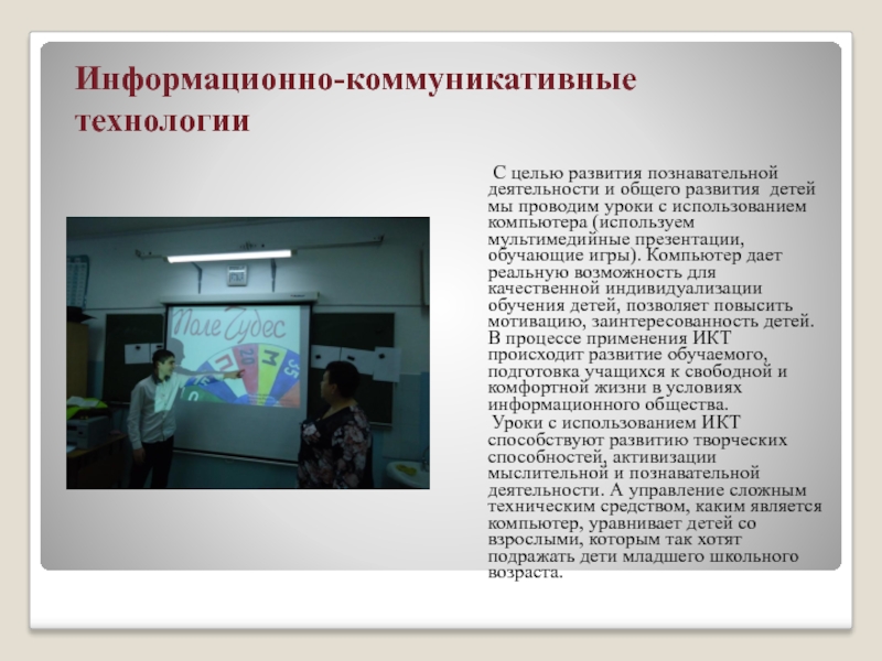 и общего развития детей мы проводим уроки с использованием компьютера (используем мультимедийные презентации, обучающие игры). Компьютер дает реальную возможность для качественной индивидуализации обучения детей, позволяет повысить мотивацию, заинтересованность детей. В процессе применения ИКТ происходит развитие обучаемого, подготовка учащихся к свободной и комфортной жизни в условиях информационного общества.