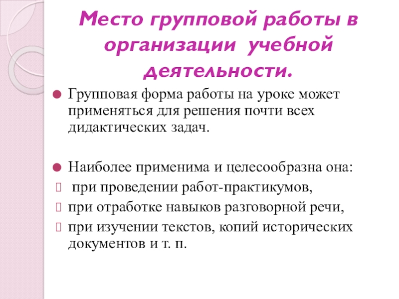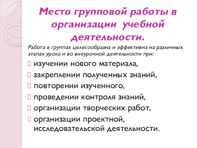 Слайд 18Место групповой (в парах) работы в организации учебной деятельности.