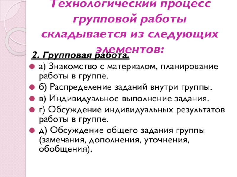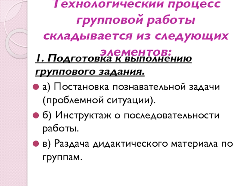 Слайд 12Технологический процесс групповой работы складывается из следующих элементов: