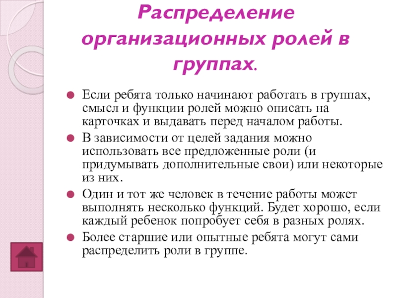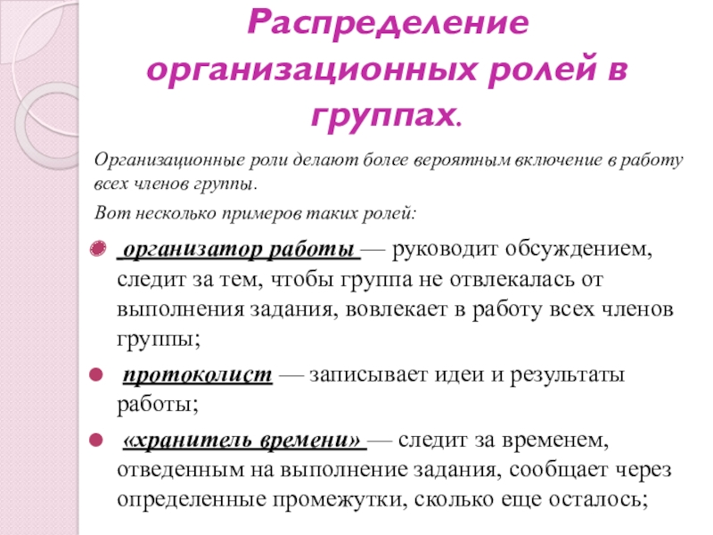 Слайд 4Организационные роли делают более вероятным включение в работу всех членов группы.
