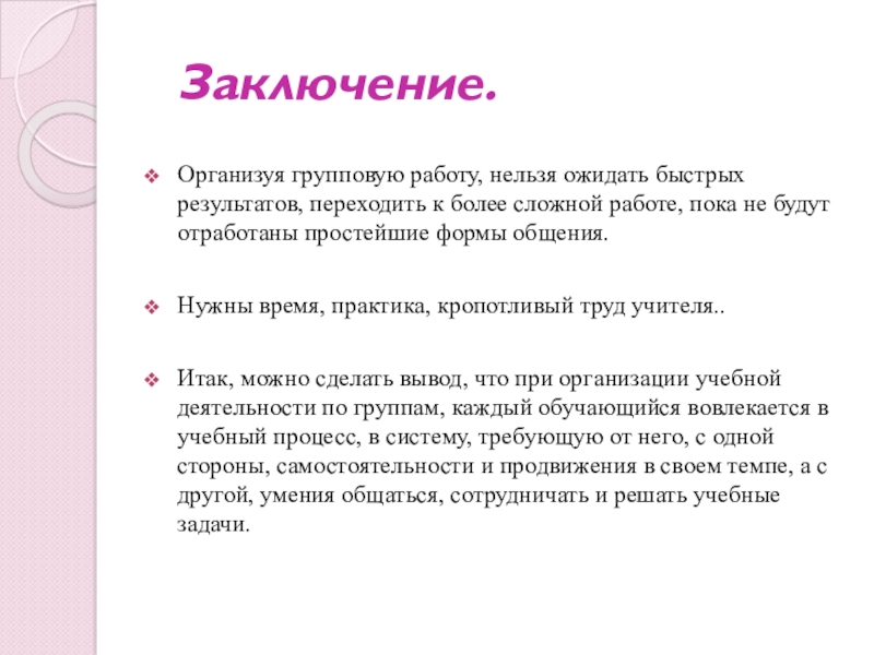 Организуя групповую работу, нельзя ожидать быстрых результатов, переходить к более сложной