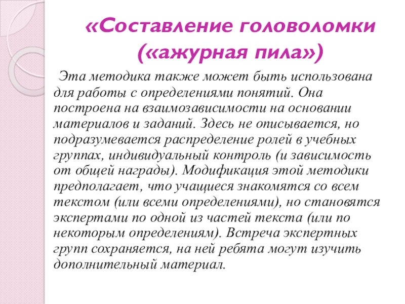 с определениями понятий. Она построена на взаимозависимости на основании материалов и заданий. Здесь не описывается, но подразумевается распределение ролей в учебных группах, индивидуальный контроль (и зависимость от общей награды). Модификация этой методики предполагает, что учащиеся знакомятся со всем текстом (или всеми определениями), но становятся экспертами по одной из частей текста (или по некоторым определениям). Встреча экспертных групп сохраняется, на ней ребята могут изучить дополнительный материал.