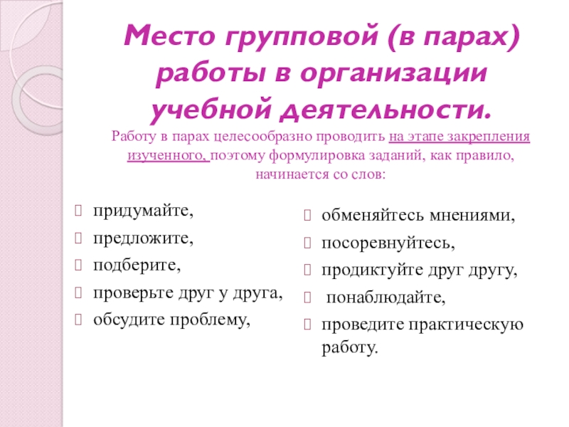 Слайд 19Место групповой (в парах) работы в организации учебной деятельности.