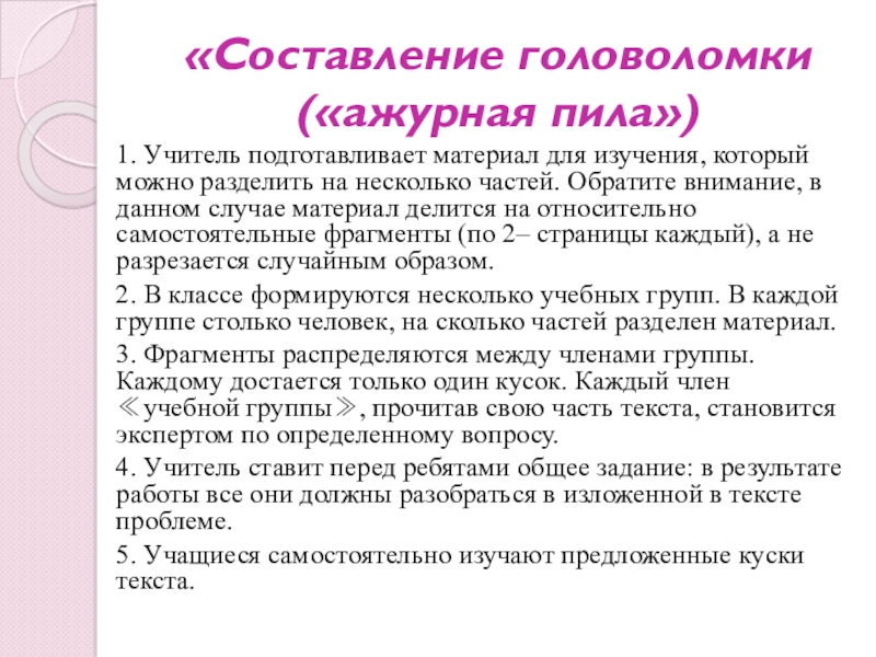 3. Фрагменты распределяются между членами группы. Каждому достается только один кусок. Каждый член ≪учебной группы≫, прочитав свою часть текста, становится экспертом по определенному вопросу.