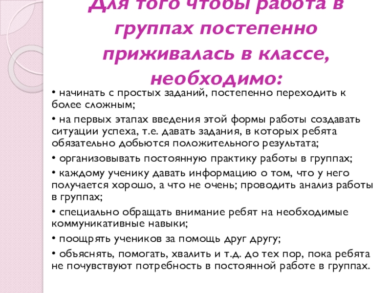 Слайд 10Для того чтобы работа в группах постепенно приживалась в классе, необходимо: