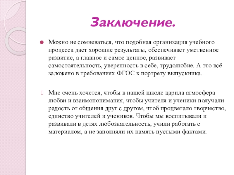 Мне очень хочется, чтобы в нашей школе царила атмосфера любви и взаимопонимания, чтобы учителя и ученики получали радость от общения друг с другом, чтоб процветало творчество, единство учителей и учеников. Чтобы мы воспитывали и развивали в детях любознательность, учили работать с материалом, а не заполняли их память пустыми фактами.