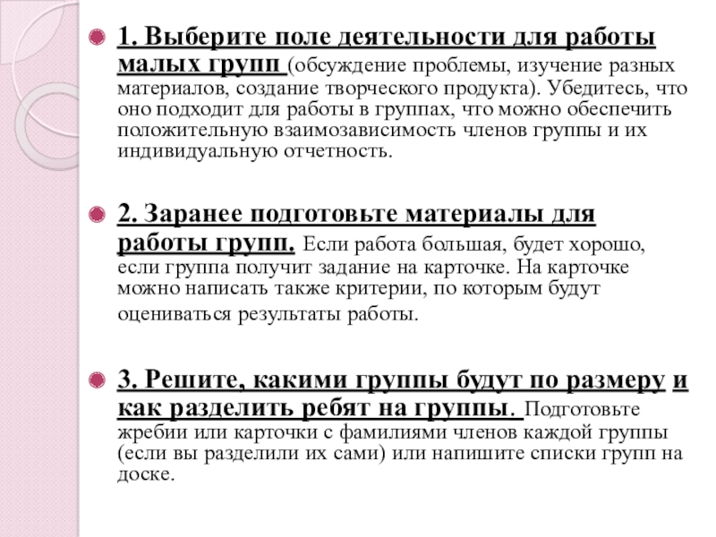 разных материалов, создание творческого продукта). Убедитесь, что оно подходит для работы в группах, что можно обеспечить положительную взаимозависимость членов группы и их индивидуальную отчетность.