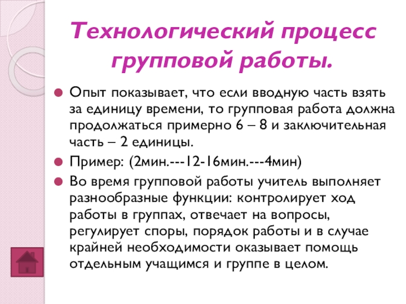 групповая работа должна продолжаться примерно 6 – 8 и заключительная часть – 2 единицы.