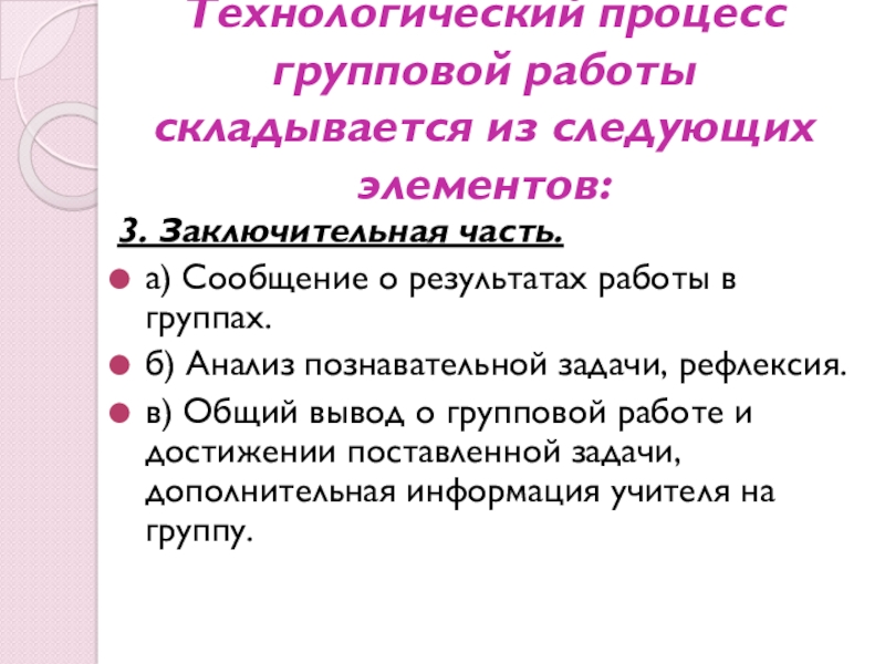 в) Общий вывод о групповой работе и достижении поставленной задачи, дополнительная информация учителя на группу.