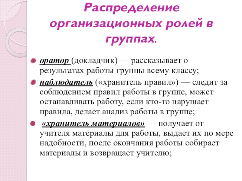 правил») — следит за соблюдением правил работы в группе, может останавливать работу, если кто-то нарушает правила, делает анализ работы в группе;