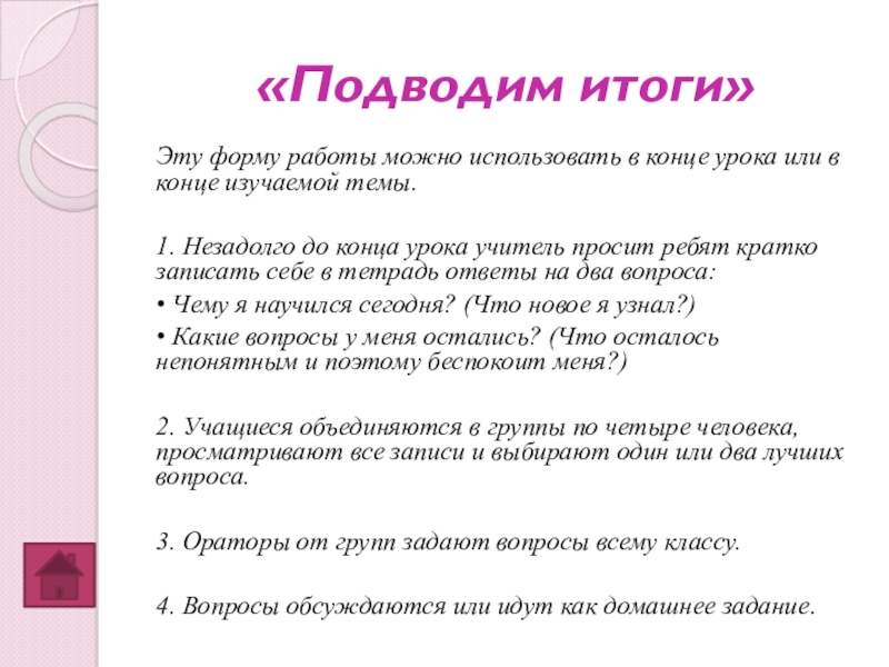 1. Незадолго до конца урока учитель просит ребят кратко записать себе в тетрадь ответы на два вопроса: