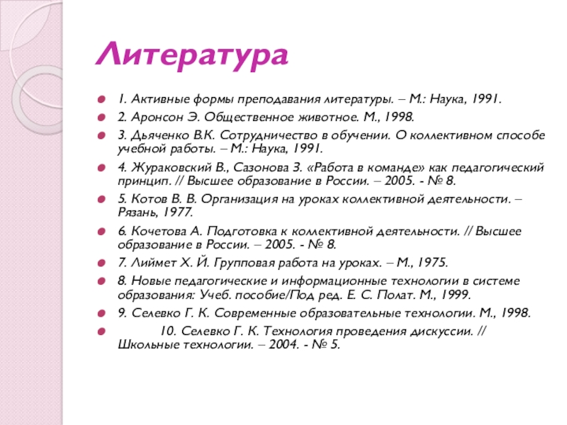 3. Дьяченко В.К. Сотрудничество в обучении. О коллективном способе учебной работы. – М.: Наука, 1991.