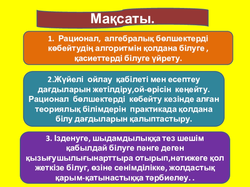 3. Ізденуге, шыдамдылыққа тез шешім қабылдай білуге пәнге деген қызығушылығынарттыра отырып,нәтижеге қол жеткізе білуг, өзіне сенімділікке, жолдастық қарым-қатынастыққа тәрбиелеу. .