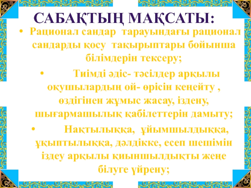 Тиімді әдіс- тәсілдер арқылы оқушылардың ой- өрісін кеңейту , өздігінен жұмыс жасау, іздену, шығармашылық қабілеттерін дамыту;