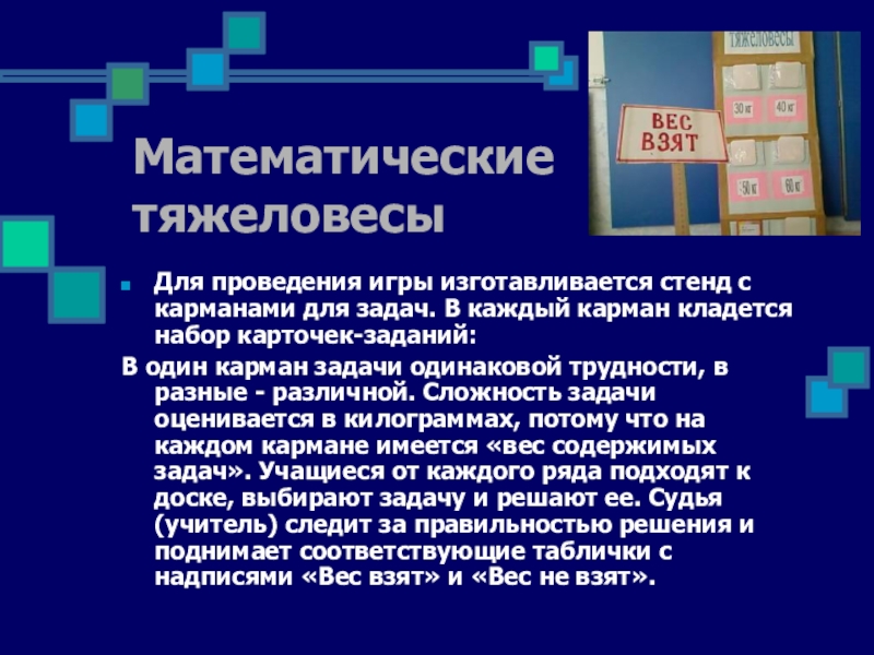 В один карман задачи одинаковой трудности, в разные - различной. Сложность задачи оценивается в килограммах, потому что на каждом кармане имеется «вес содержимых задач». Учащиеся от каждого ряда подходят к доске, выбирают задачу и решают ее. Судья (учитель) следит за правильностью решения и поднимает соответствующие таблички с надписями «Вес взят» и «Вес не взят».