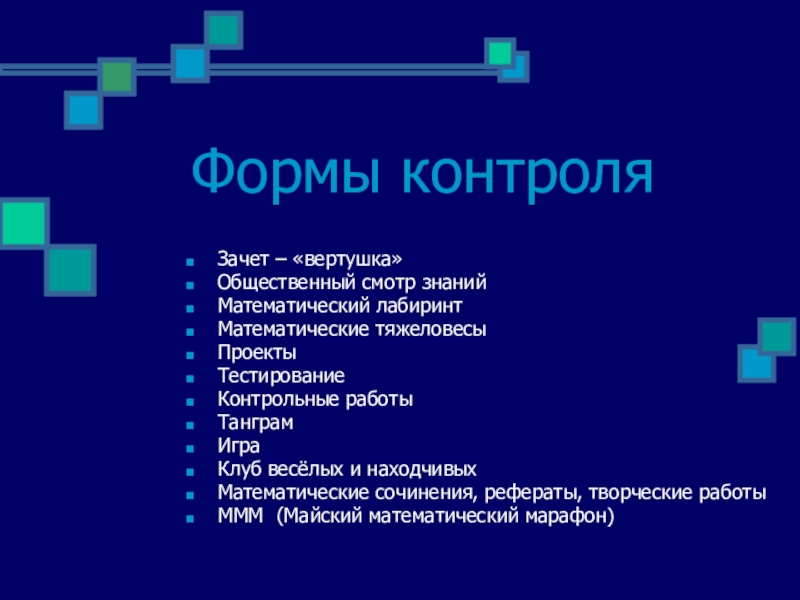 Формы контроляЗачет – «вертушка»Общественный смотр знанийМатематический лабиринтМатематические тяжеловесыПроектыТестированиеКонтрольные работыТанграмИграКлуб весёлых и находчивыхМатематические сочинения, рефераты, творческие работыМММ (Майский
