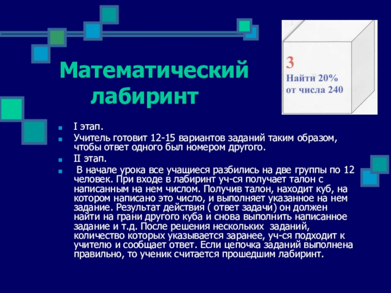 В начале урока все учащиеся разбились на две группы по 12 человек. При входе в лабиринт уч-ся получает талон с написанным на нем числом. Получив талон, находит куб, на котором написано это число, и выполняет указанное на нем задание. Результат действия ( ответ задачи) он должен найти на грани другого куба и снова выполнить написанное задание и т.д. После решения нескольких заданий, количество которых указывается заранее, уч-ся подходит к учителю и сообщает ответ. Если цепочка заданий выполнена правильно, то ученик считается прошедшим лабиринт.
