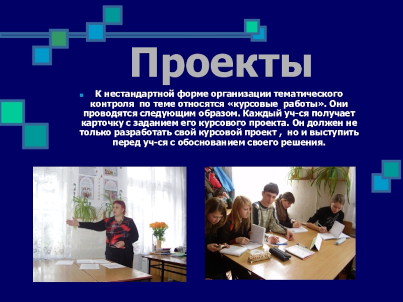 ПроектыК нестандартной форме организации тематического контроля по теме относятся «курсовые работы». Они проводятся следующим образом. Каждый уч-ся