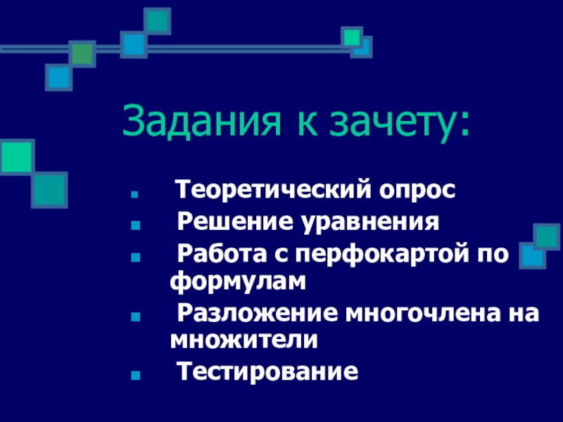 Задания к зачету: Теоретический опрос Решение уравнения Работа с перфокартой по формулам Разложение многочлена на множители Тестирование