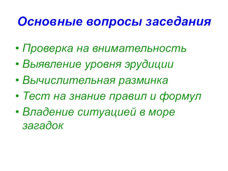 Основные вопросы заседанияПроверка на внимательность Выявление уровня эрудицииВычислительная разминкаТест на знание правил и формулВладение ситуацией в море загадок