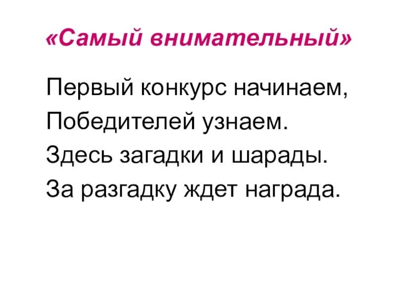 «Самый внимательный»Первый конкурс начинаем,Победителей узнаем.Здесь загадки и шарады.За разгадку ждет награда.