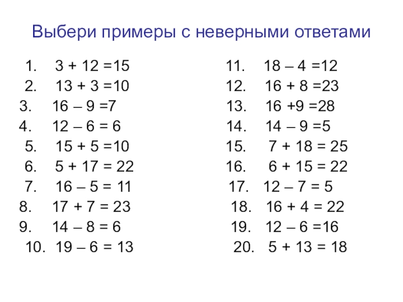 Выбери примеры с неверными ответами 1.  3 + 12 =15