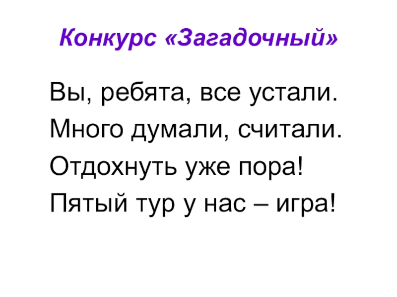 Конкурс «Загадочный»Вы, ребята, все устали.Много думали, считали.Отдохнуть уже пора!Пятый тур у нас – игра!