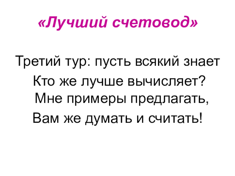 «Лучший счетовод»Третий тур: пусть всякий знает Кто же лучше вычисляет?