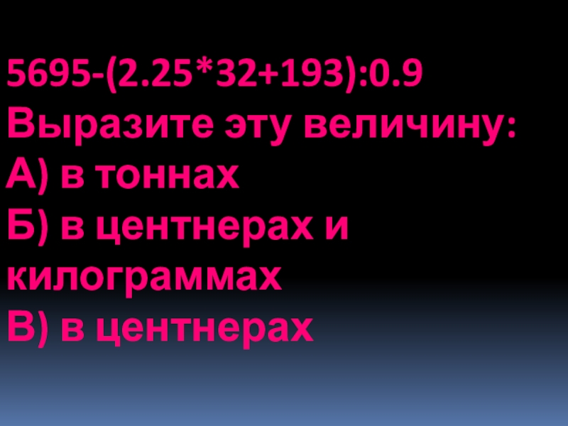 5695-(2.25*32+193):0.9Выразите эту величину:А) в тоннахБ) в центнерах и килограммах В) в центнерах