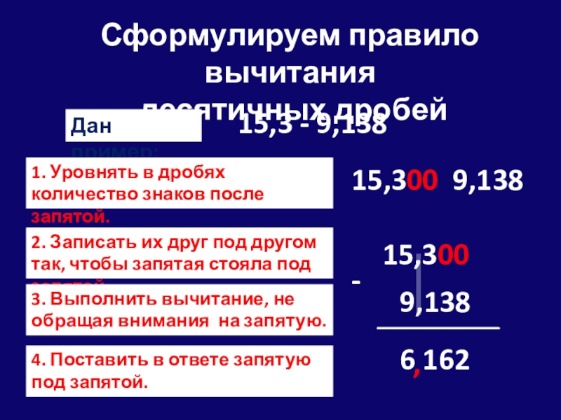 3. Выполнить вычитание, не обращая внимания на запятую.