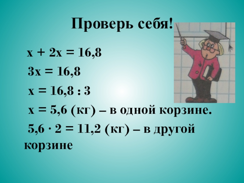 5,6 ∙ 2 = 11,2 (кг) – в другой корзине
