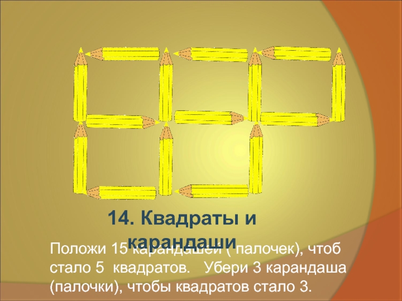 Слайд 24Положи 15 карандашей ( палочек), чтоб стало 5 квадратов. Убери