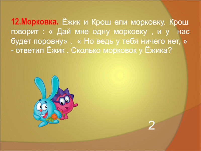 мне одну морковку , и у нас будет поровну» . « Но ведь у тебя ничего нет, » - ответил Ёжик . Сколько морковок у Ёжика?