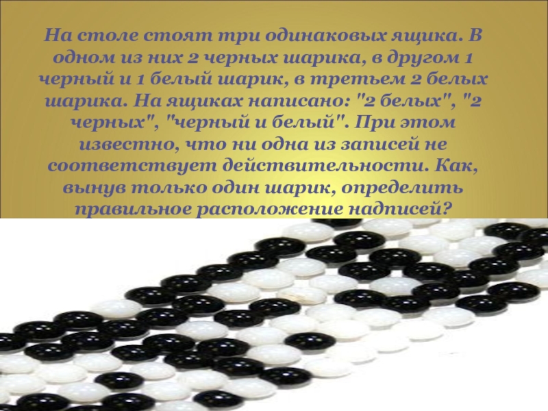 Слайд 6На столе стоят три одинаковых ящика. В одном из них 2