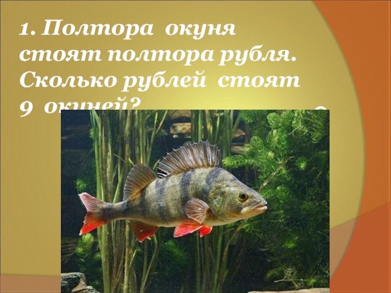 Слайд 21. Полтора окуня стоят полтора рубля. Сколько рублей стоят