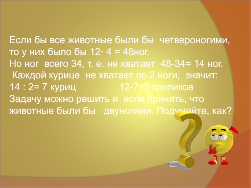 Задачу можно решить и если принять, что животные были бы двуногими. Подумайте, как?
