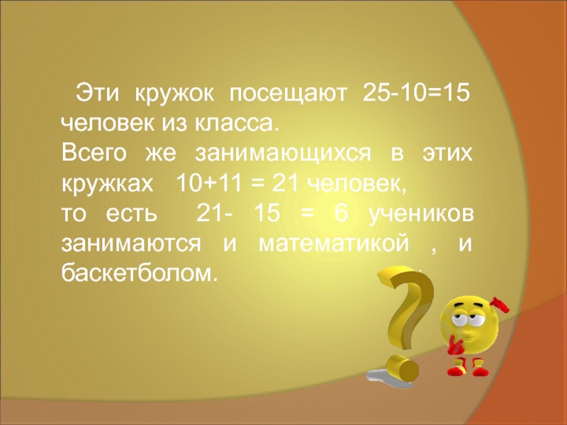 Слайд 9 Эти кружок посещают 25-10=15 человек из класса.