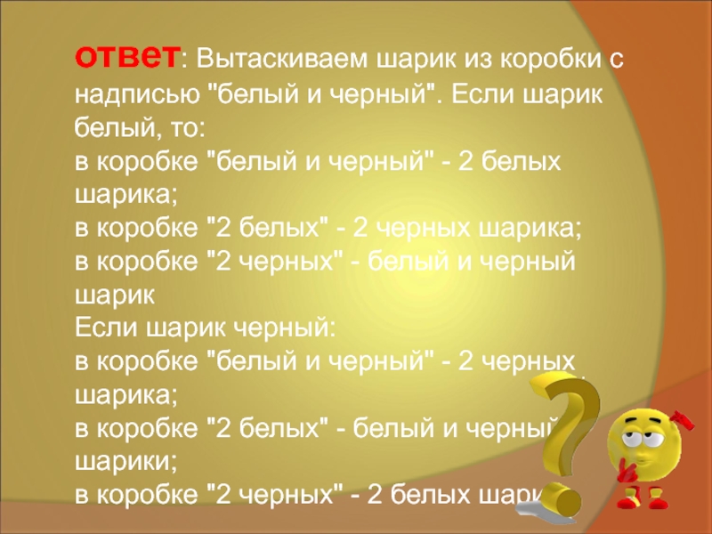 Слайд 7ответ: Вытаскиваем шарик из коробки с надписью "белый и черный". Если