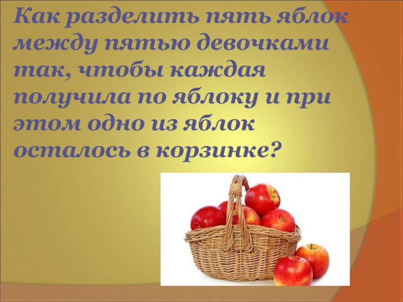 Слайд 3Как разделить пять яблок между пятью девочками так, чтобы каждая получила