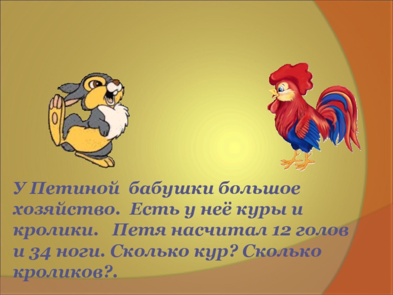 Петя насчитал 12 голов и 34 ноги. Сколько кур? Сколько кроликов?.
