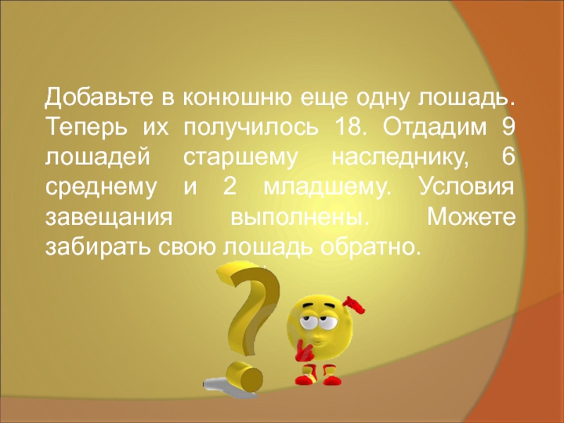 Слайд 20Добавьте в конюшню еще одну лошадь. Теперь их получилось 18. Отдадим